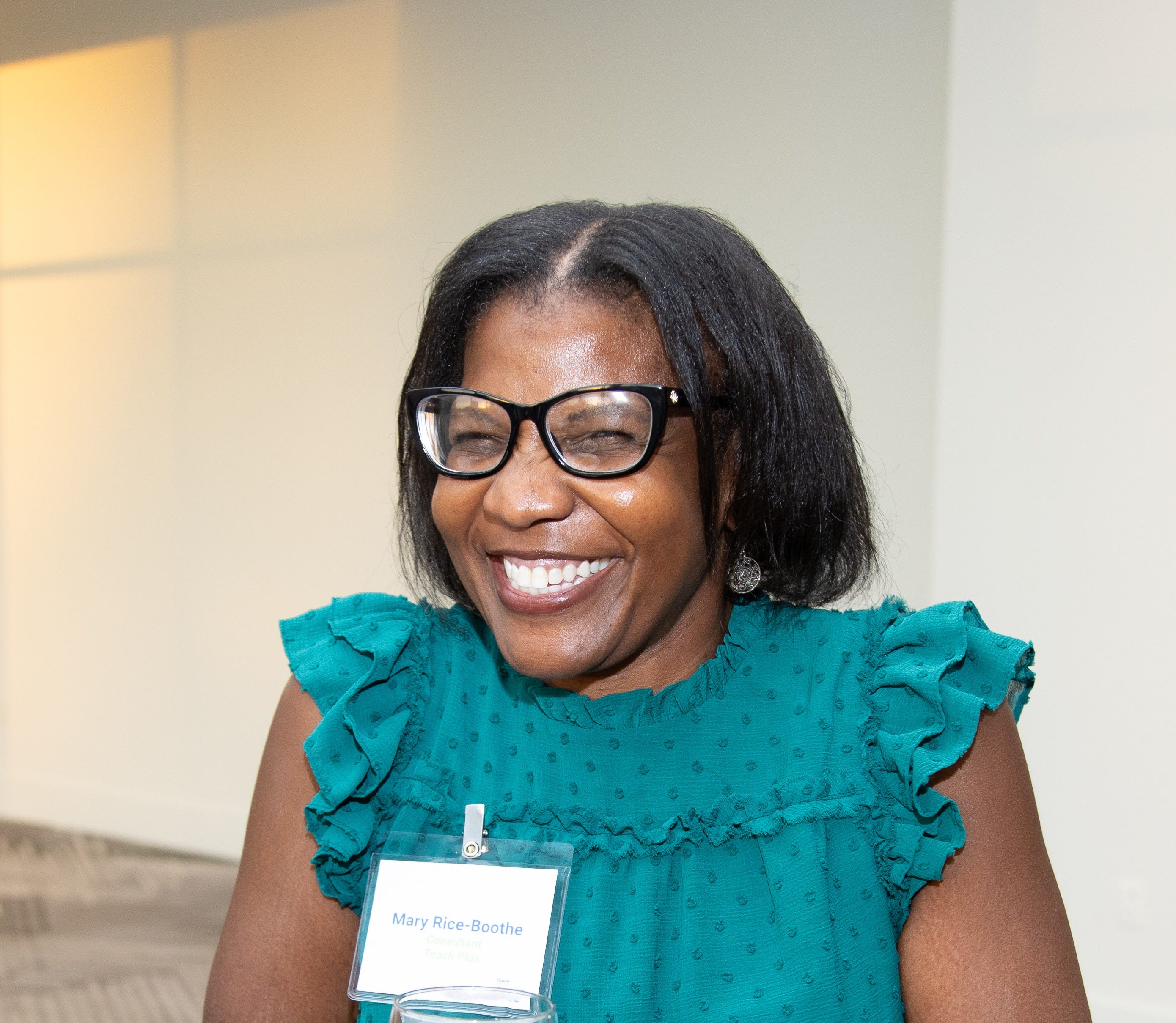 Photo Description: The author is wearing a green dress with her name tag carefully clipped onto a ruffle on her chest. She is smiling so hard you can’t see her eyes. Photo by Erica Johnson Photography.