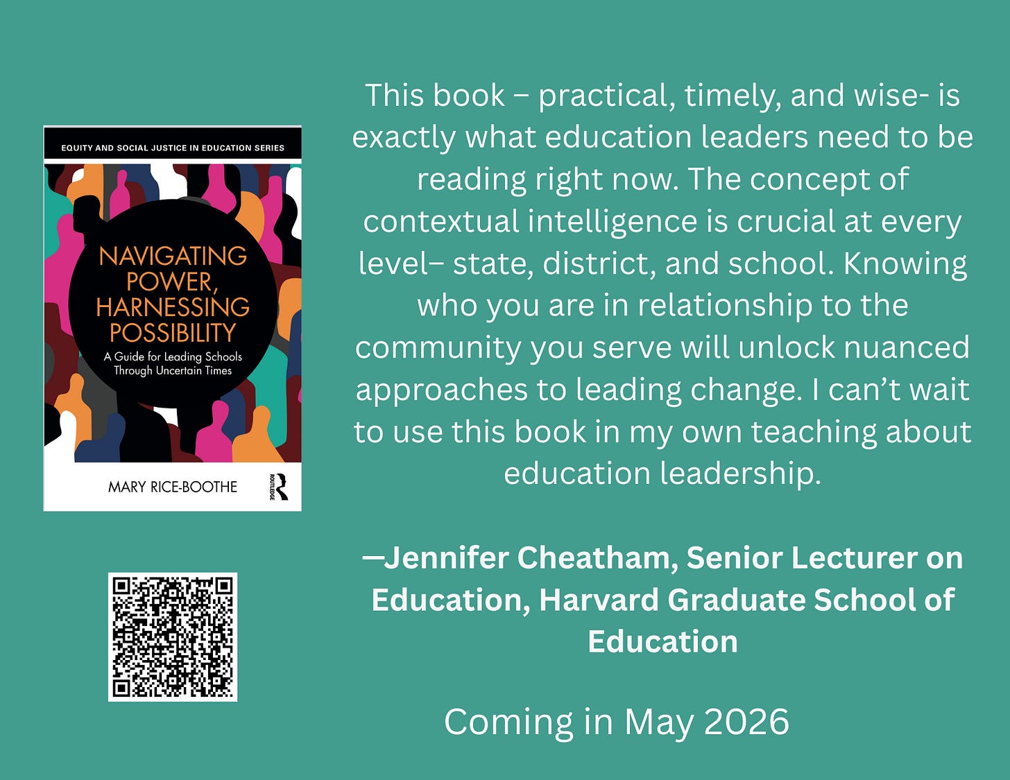 Photo Description: In white lettering with a teal background, a quote from Jennifer Cheatham that says, "This book – practical, timely, and wise- is exactly what education leaders need to be reading right now. The concept of contextual intelligence is crucial at every level– state, district, and school. Knowing who you are in relationship to the community you serve will unlock nuanced approaches to leading change. I can’t wait to use this book in my own teaching about education leadership.”